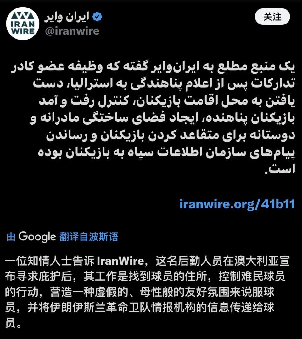 今日,又有一名球员撤回庇护并乘机返回(队长扎赫拉-甘巴里)。也就是说,7名留在澳洲的伊朗成员中,目前只剩2人还留在澳洲,其他5人都反悔了。