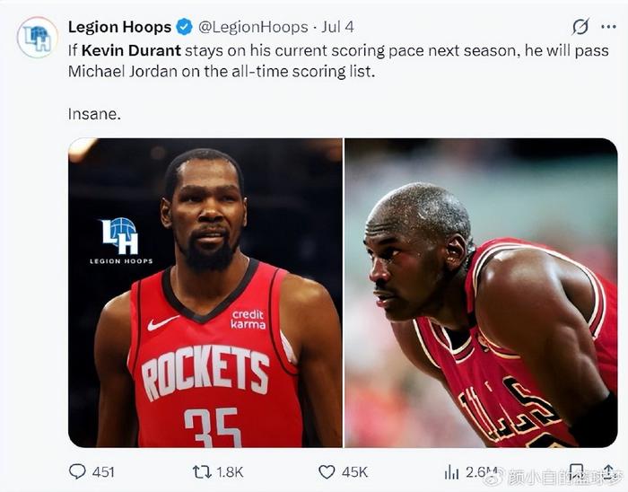 除此之外,杜兰特也将迎来个人的里程碑,目前杜兰特30571分,乔丹32292分,杜兰特还差1721分就要超过乔丹,历史即将发生,KD已经是这项运动最出色的得分手,他的得分能力已经达到几乎不可触及的状态。