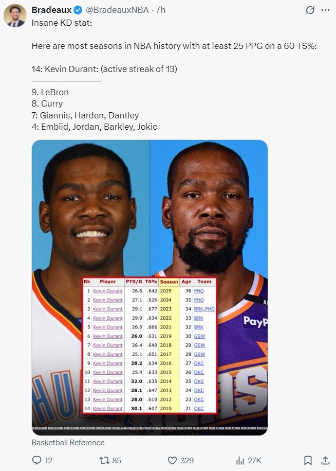 杜兰特上赛季是场均26.6分+命中率52%+三分命中率43%,真实命中率高达64%,他职业生涯已经有14个赛季达到场均25+真实命中率60%NBA历史唯一,乔丹只有4个赛季,詹姆斯有9个,库里有8个。